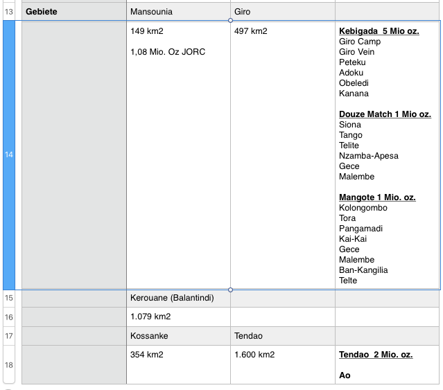 Üblicherweise setzt Herr Eckhof seine Prognosen aber niedrig an und stockt dann auf. Das war in Kibali und auch in Mansounia so. Leider waren im letztgenannten dann keine weiteren Goldfunde mehr zu erbohren. Das ist hier anders. Giro und Tendao ist gespickt mit Satelliten, auf denen schon signifikant Gold erbohrt wurde,