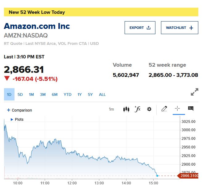 sehe ich bei den $2400, dem kleinn Zwischenplateau vom Mai und wenn es da auch durchrauscht, kann es auch auf $2000 runtergehen., zumal ich keine ausreichende Rechtfertigung mehr dafür sehe, dass das KGV für 2022 mit 56 immer noch ca doppelt so hoch ist wie das von Microsoft (31) oder Apple (28) oder Alphabet (23) .