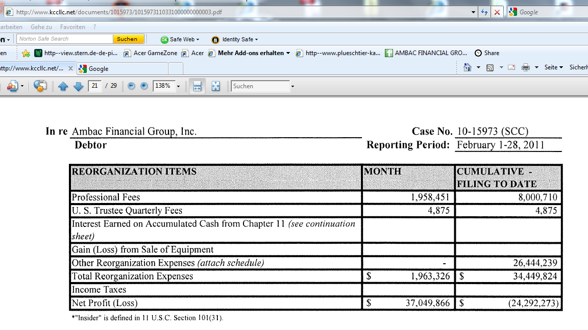 "Als Takefuji ihre Probleme hatte die Gebühren für die Versicherung zu zahlen gab es ein Geschäft der ABK den Zugriff auf wesentlich, also 302 Mrd Yen, gewährt. Ich denke dass man Prozentual gesehen aus der Konkursmasse von Takefuji dann die Gebühr hätte gerade so eben begleichen können. Ich meine das man von den 302 Mrd Yen an Forderung einen Teil hätte abschreiben müssen. Da nun aber Interessenten die Takefuji kaufen ist dies ein glücklicher Umstand für AMBAC."
