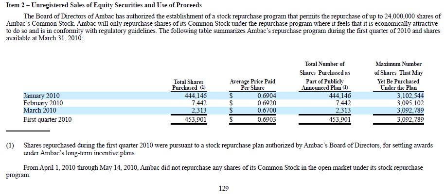 Für das letzte Quartal weitete sich der Verlust für Ambac $ 690.100.000 oder $ 2,39 pro Aktie, von $ 392.200.000 oder $ 1,36 pro Aktie, ein Jahr zuvor. Die letzten Quartals ist ein 1,71 $ einen Anteil negativen Auswirkungen aus der Umstellung der Rechnungslegung.