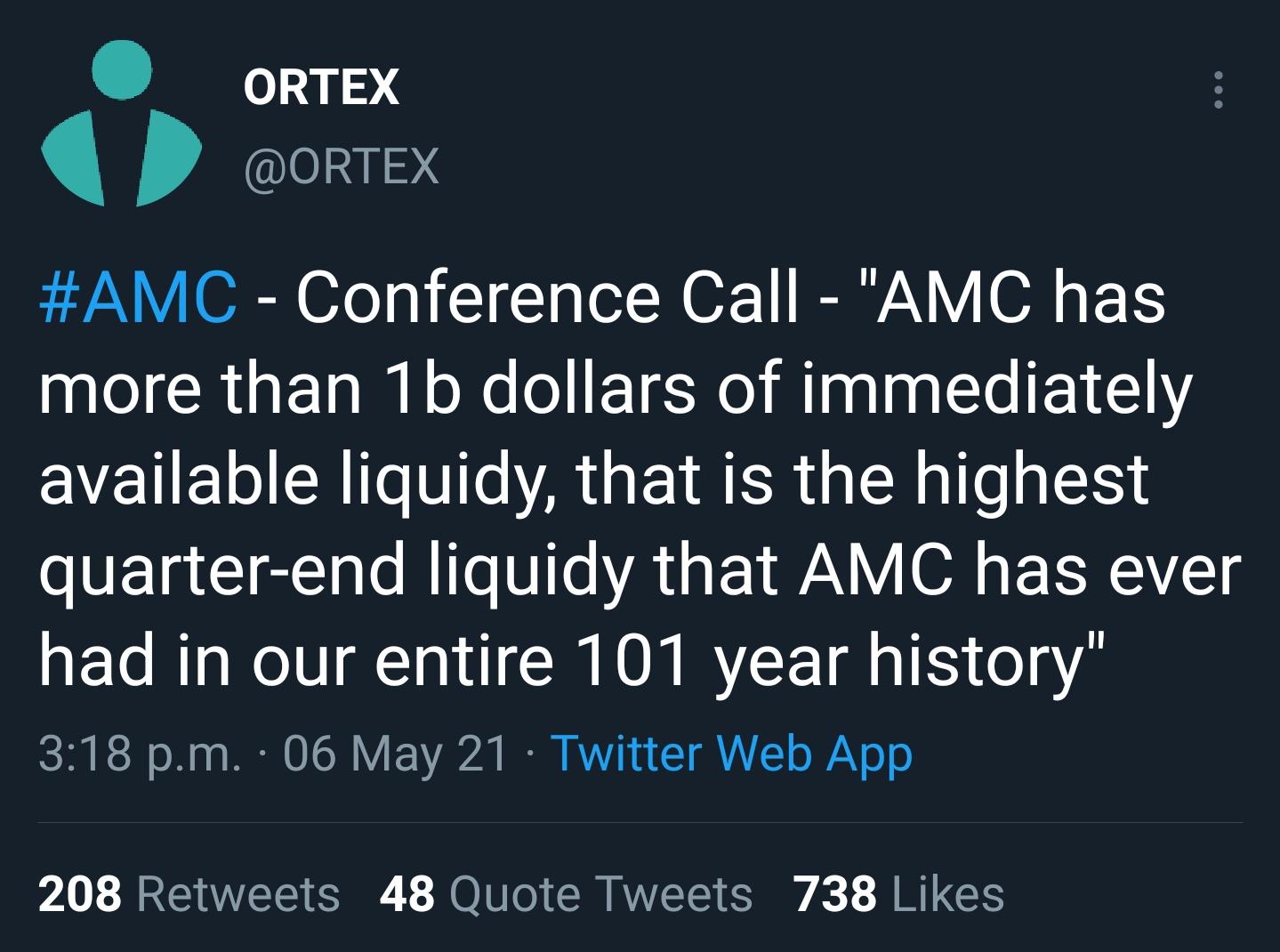 Und selbst wenn keine Übernahmeofferte kommen wird, die heute vorgelegten Zahlen und der Earning Call haben eindeutig gezeigt, dass wir vor einer Insolvenz von AMC keine Angst mehr haben müssen und AMC eine mehr als positive Zukunft offensteht und somit ein Totalverlust unseres Investments nahezu ausgeschlossen ist und dies heißt, wir sollten spätestens bis Ende nächsten Jahres die von mir bereits von Anfang an prognostizierten 15$ - 20$ sehen (falls der erhoffte Squezze oder die Übernahme ausbleibt) und so sah es ja Adam Aron vor kurzem auch noch, als er sagte, dass er AMC mindestens bei einer Marktkapitalisierung von 5 Milliarden USD sieht.