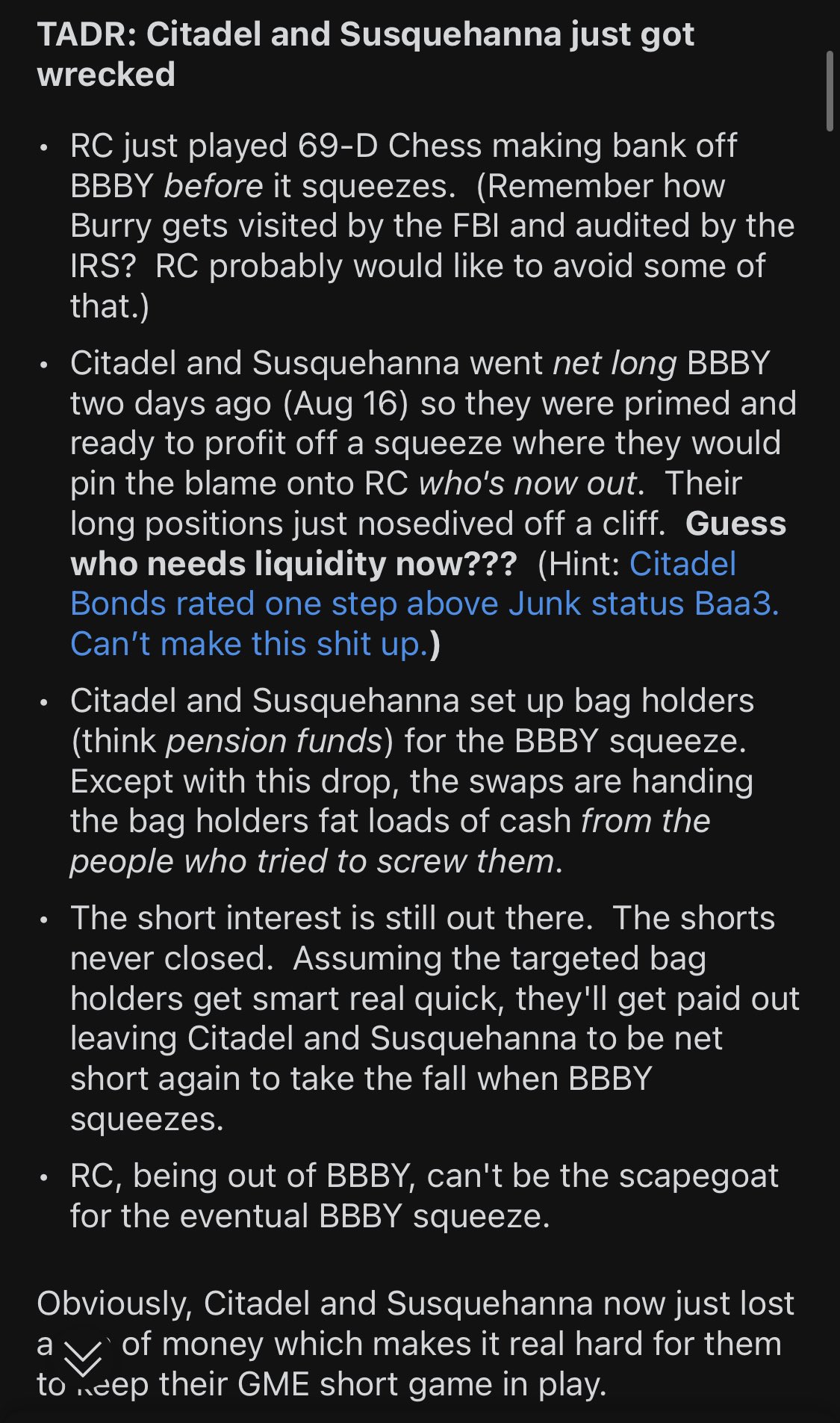 Echt dein Ernst? Du "verteidigst" den Typ immer noch bzw. suchst immer noch evtl. positive Effekte seines kriminellen Handelns raus? Sind wir bzw. dein Vater in BBBY investiert und sitzen jetzt auf evtl. Verlusten, die du nie wieder ausgleichen können wirst? BBBY wird von manchen ANALysten in der Top 10 geführt, die sehr bald pleite gehen könnten. Wer hier oberhalb der 15$ investiert hat, wird sein Geld auf absehbare Zeit nie wieder sehen. Ich hatte gestern um diese Zeit ca. ein Blutbad bei BBBY angekündigt gehabt und dieses ist eingetreten. Gestern hätte man um diese Zeit ca. mit noch gerade einmal -10% rauskommen können mit Kursen zwischen 20$ bis 21$, jetzt sind es, ein Tag später, schon mindestens -60% und Kursen zwischen 10$ bis 11$. Die gesamte Causa BBBY war so leicht zu durchschauen. Von Anfang an. Was hingegen nicht zu durchschauen war, dass Rhyan Cohen ein Teil des Systems geworden ist, welches wir bekämpfen wollen. Und ich prognostiziere jetzt bereits schon, dass dies auch auf GME abfärben wird. Solange ein Rhyan Cohen in GME aktiv ist, solange wird es bei GME keinen Short Squeeze mehr geben, denn auch dort würd er ihn wenn abwürgen mit seinen Verkäufen. Und selbst wenn Rhyan Cohen dort sich vom Acker macht, wird GME nicht mehr squeezen, weil bei GME schon lange nicht mehr die Basis stimmt. Im Gegensatz zu AMC tummeln sich dort laut Stonk-O-Tracker gerade einmal knapp 45% an Privatanlegern, während es hingegen bei AMC > 90% ist. Mit anderen Worten, bei GME haben, im Gegensatz zu AMC, die "Kleinanleger" nicht mehr das Ruder in der Hand. Hinzu kommt, dass GME sich auf einem absteigenden Ast befindet und eine wirkliche Besserung nicht in Sicht ist. Ich bin inzwischen heilfroh, dass ich mich damals zu recht gegen GME und für AMC entschieden habe, alleine schon wegen unserem einzigartigen CEO Adam Aron. Einen so demütigen Ehrenmann, welchen es in der heutigen Zeit immer seltener gibt. Wenn ich dagegen sehe, welch ein Chaos bei GME herrscht und dies, ohne mich jetzt tiefer mit GME zu beschäftigen. Kein Wunder bei einem Rhyan Cohen, welcher nur seinen eigenen Profit im Auge hat. Wir wollen gegen die Heuschrecken der Finanzmärkte kämpfen und unterstützen noch solch einen Typen, der sich jetzt ganz klar und für jeden ersichtlich als Heuschrecke geoutet hat? Mit dieser Woche wurde der GME Squeeze Gedanke von Rhyan Cohen zu Grabe getragen und noch bekommt man 34$ für eine GME - Aktie, vielleicht in der nächsten Zeit auch noch mal 40$. Was ich damit sagen will, kannst du dir bestimmt denken, oder? Was du und dein Vater daraus macht, ist mir gelinde gesagt sch... egal. Dein Geld und nicht meines oder sollte ich sagen, bald das Geld von Rhyan Cohen?
