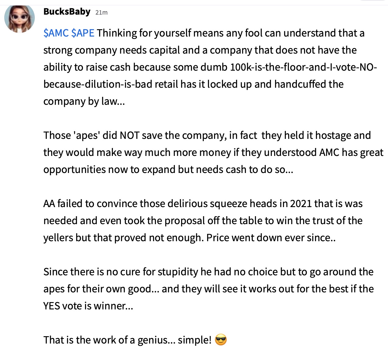 Kurz zusammengefasst von mirt: Jedes Unternehmen braucht Geld, um handlungsfähig zu bleiben, AMC wird aber durch Retail behindert, obwohl durch zusätzliches Kapital AMC in der Lage wäre, durch weitere Investitionen und Expansion zukünfigt mehr Geld zu verdienen!