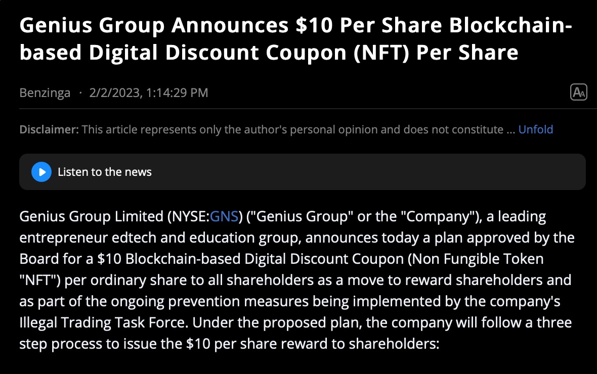 Genius Group kündigt Blockchain-basierten digitalen Rabattcoupon (NFT) im Wert von 10 US-Dollar pro Aktie an