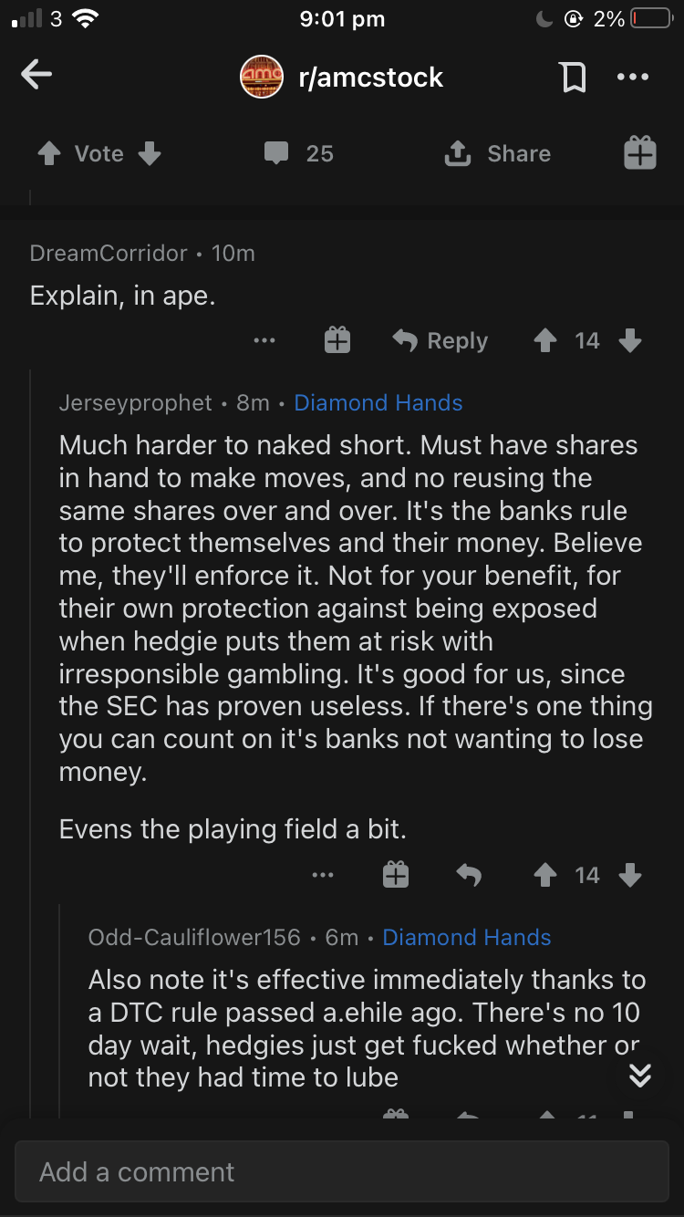 As we all read the new 005 filing (www.dtcc.com/-/media/Files/Downloads/...C/SR-DTC-2021-005.pdf ), I wanted to paste a paragraph from page 39 which might help explain what we’re actually dealing with. Seems as though they’re changing their settlement guide (www.dtcc.com/-/media/Files/Downloads/...uides/Settlement.pdf) to reflect the current practices happening today, and that nothing is actually changing in terms of current practices… “For the sake of clarity, and as more fully described above, this proposed rule change will not alter DTC’s current practices. Rather, it will merely clarify how securities Pledged through DTC are recorded in DTC’s system. More specifically, and as more fully described above, the Settlement Guide currently states that Securities Pledged through DTC are held in an account of the Pledgee. However, in practice, the Securities remain in the Pledgor’s account but are marked as Pledged. This is the existing practice today and will not change. Rather, the proposed change will clarify the text of the Settlement Guide to better reflect the current practice. The change will not affect the legal rights or obligations of the parties involved in the pledge.