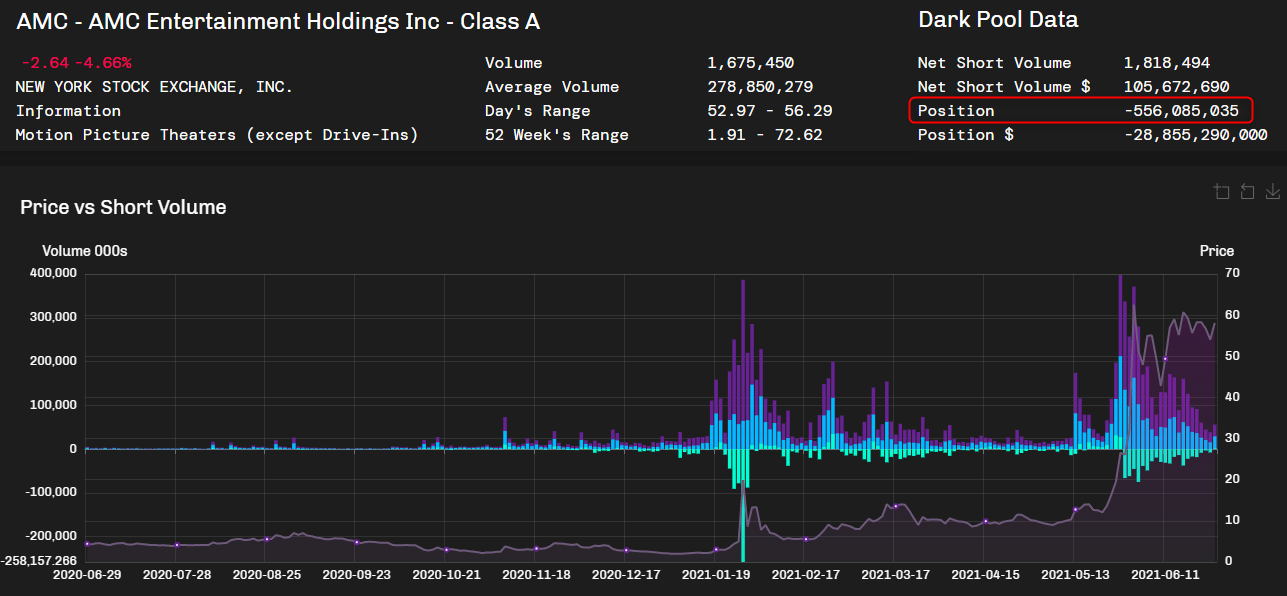 The goal of this page is to show the cumulative net short dollar volume (Dark Pool Position $) by security. Is it calculated by taking the net short volume (short volume minus buy volume - a positive number means that the short volume was higher than the buy volume) times the closing price and taking the 20-day cumulative sum of this series. A positive position or position $ would be bullish, and a negative one bearish.