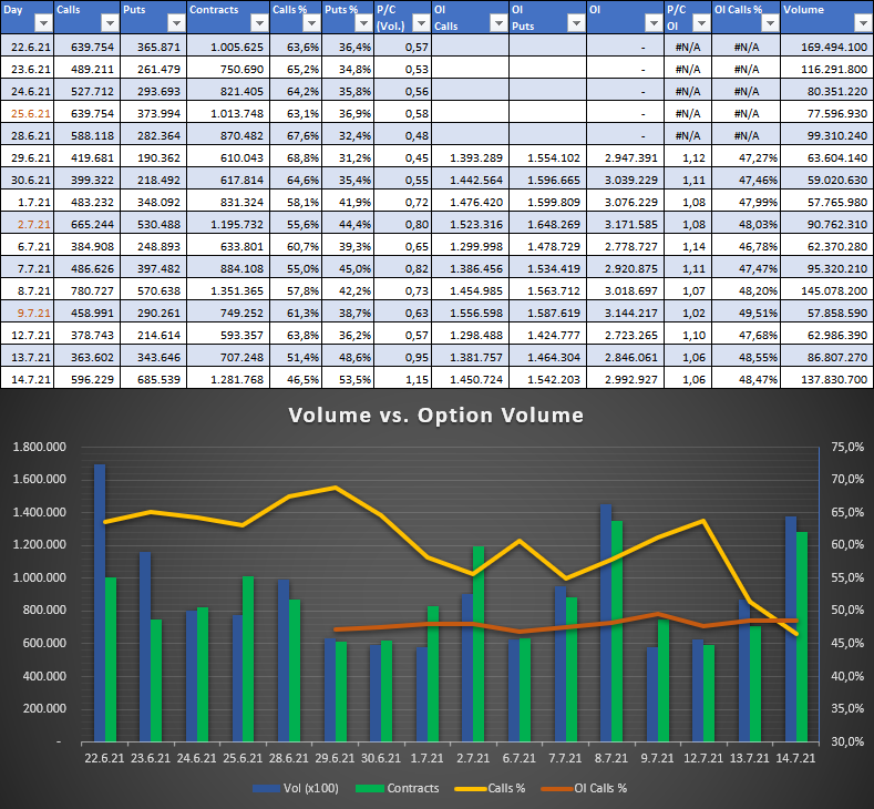 Überraschend ist jedoch das P/C Verhältnis bei den offenen Kontrakten insgesamt (OI): dieses ist in etwa gleich geblieben (1,06), mit 48,5% offenen Calls. Da bei dem OI auch weit in der Zukunft liegende Verfallstage betrachtet werden, zeigt es, dass sich in der mittel- und langfristigen Betrachtung für die Optionshändler nicht viel geändert hat.