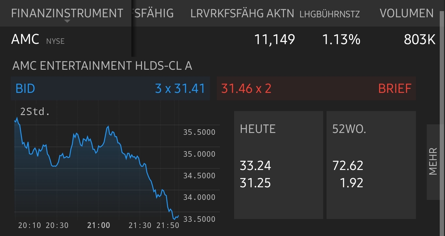 Die Barchart Opinion hat nur noch 56% bullische Signale, wobei die bearischen sehr schwach sind (man kann unter folgendem Link auf "Strength & Direction" klicken, um die Stärke und Richtung der 13 Indikatoren zu sehen). Die Entwicklung ist bei den fallenden Kursen ebenfalls nachvollziehbar. Link: www.barchart.com/stocks/quotes/AMC/opinion