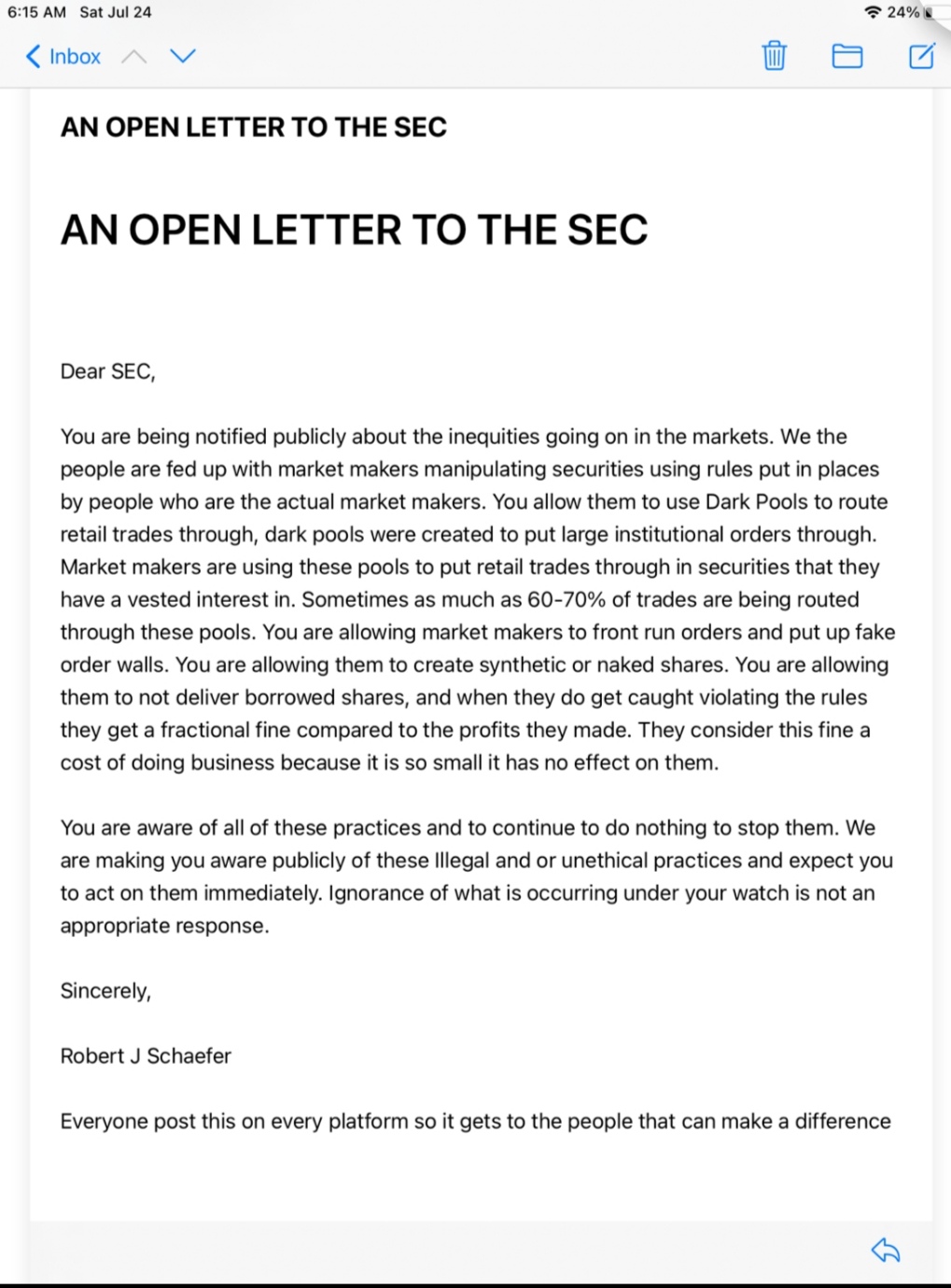 - Es könnte auch sein, dass wir irgendwann Angebote für unsere Shares bekommen, vergleichbar mit dem eines Übernahmeangebotes. Dies würde meiner Meinung nach aber nicht ohne die SEC, als Vermittler, gehen und bei dieser Art des „managed Squeezes“ würde wohl das gesamte Ausmaß der Manipulation an die Oberfläche kommen und somit die illegalen Machenschaften unserer „Freunde“, was wohl auch dann strafrechtliche Ermittlungen auslösen würden. Daher halte ich dies eher für unwahrscheinlicher.