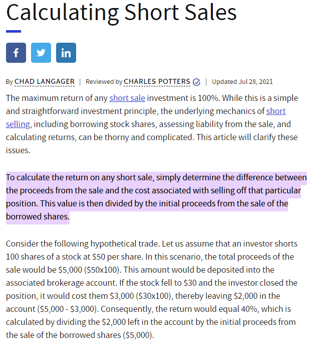 Um die Rendite eines Leerverkaufs zu berechnen, ermitteln Sie einfach die Differenz zwischen dem Erlös aus dem Verkauf und den Kosten, die mit dem Schließen der betreffenden Position verbunden sind. Dieser Wert wird dann durch den ursprünglichen Erlös aus dem Verkauf der geliehenen Aktien geteilt.