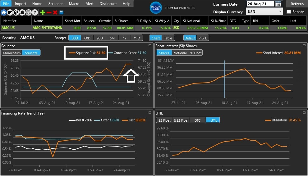 S3 overlays the associated profit & losses with a short position in a company across multiple durations to accentuate the larger impact of recent profits & losses on investment decisions. I use the Squeeze Risk Score to screen for stocks that are at risk of a potential short squeeze.