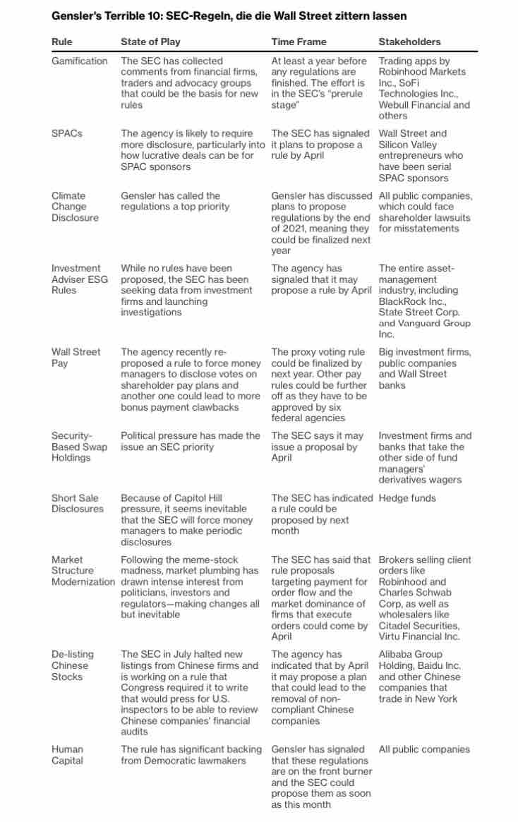 But for Wall Street, Gensler’s plans are hardly something to laugh about. He’s laying out one of the most ambitious agendas in the SEC’s 87-year history -- some 49 proposals, many already drawing opposition from hedge funds, stock exchanges, online brokers and public companies. He’s been similarly aggressive on agency enforcement cases, which can tank share prices, spur fines and trigger embarrassing publicity