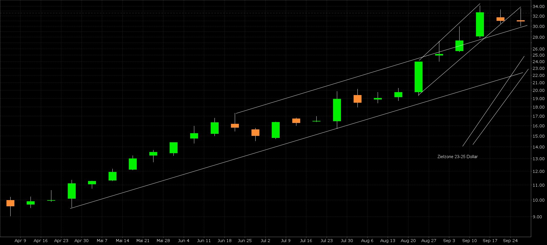 Enttäuschen die Zahlen, verlassen wir den Kanal. Seitwärts, Abwärts bis auf 200Tagelinie 15$ mit Kursen wie im Juli? Wir werdens sehen.