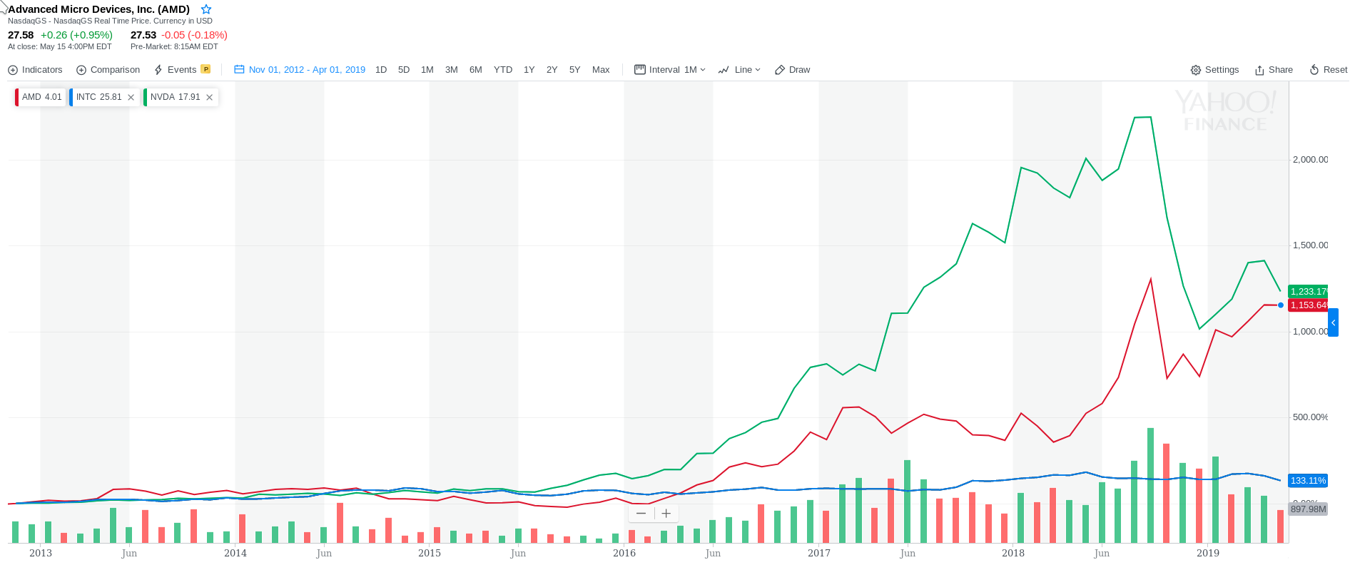 Auch wenn technisch CPU und GPU noch kaum voneinander profitieren, spiegeln sie sich im Aktienpreis wider. Für beide Sparten sind die Umsatzerwartungen im Aktienwert eingepreist.