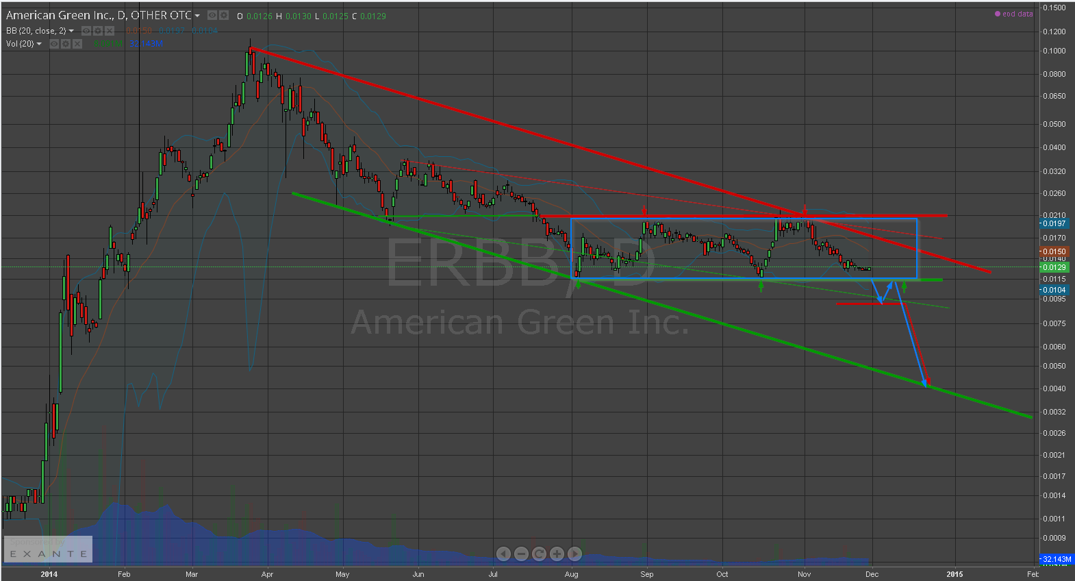 AMERICAN GREEN: Die Trendoberkante hat erneut gehalten, die Flagge wurde negiert. Somit geht ERBB erneut in die nächste Tradingbox-Runde. Dies befindet sich offensichtlich zwischen0,0115-0,022. Nun, am unteren Ende der Box angelangt ergeben sich 2 Handlungsalternativen: