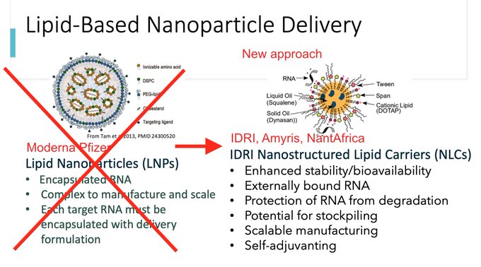 Ich wiederhole es nochmal "ground-breaking vaccine technology" in der Entwicklung. Man nehme ein Lipid Carrier, also ein Trägermolekül, und "klebt" extern eine RNA dran. Und Squalene wirkt als Adjuvant. Und das ganze kann vielleicht auf die Krebsforschung übertragen werden.