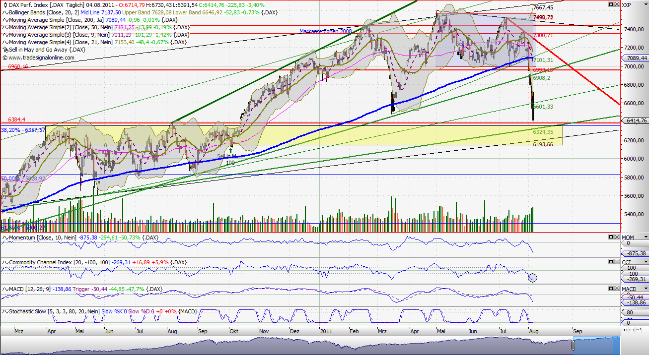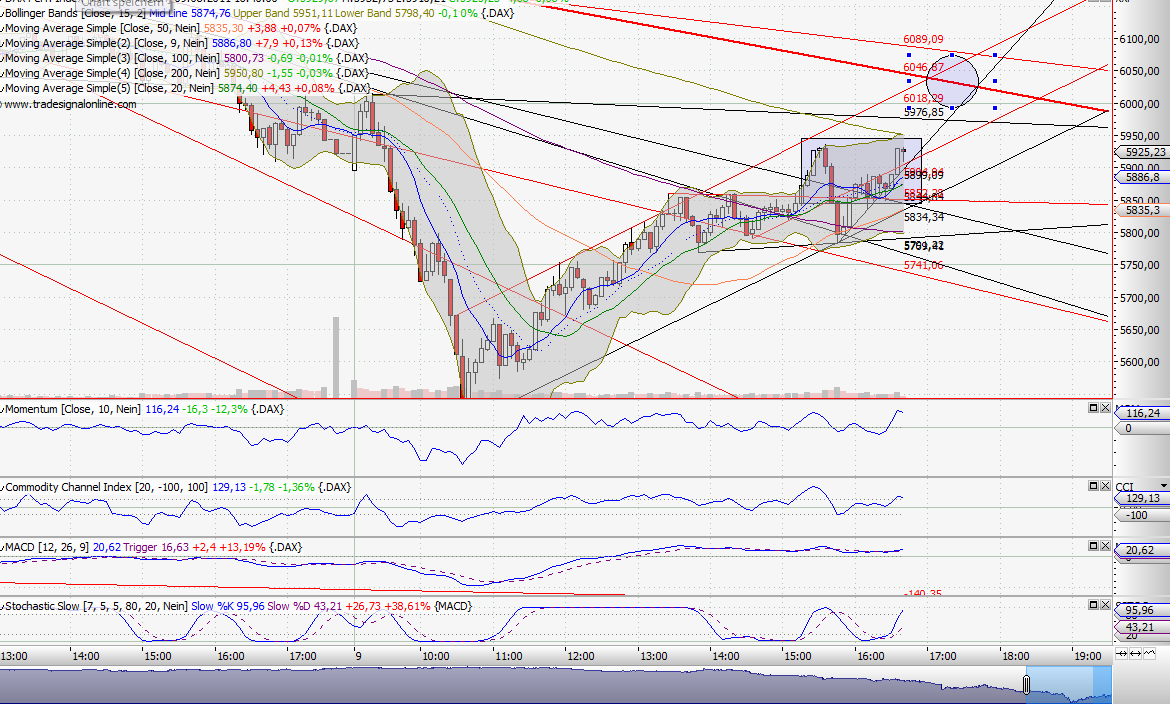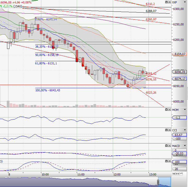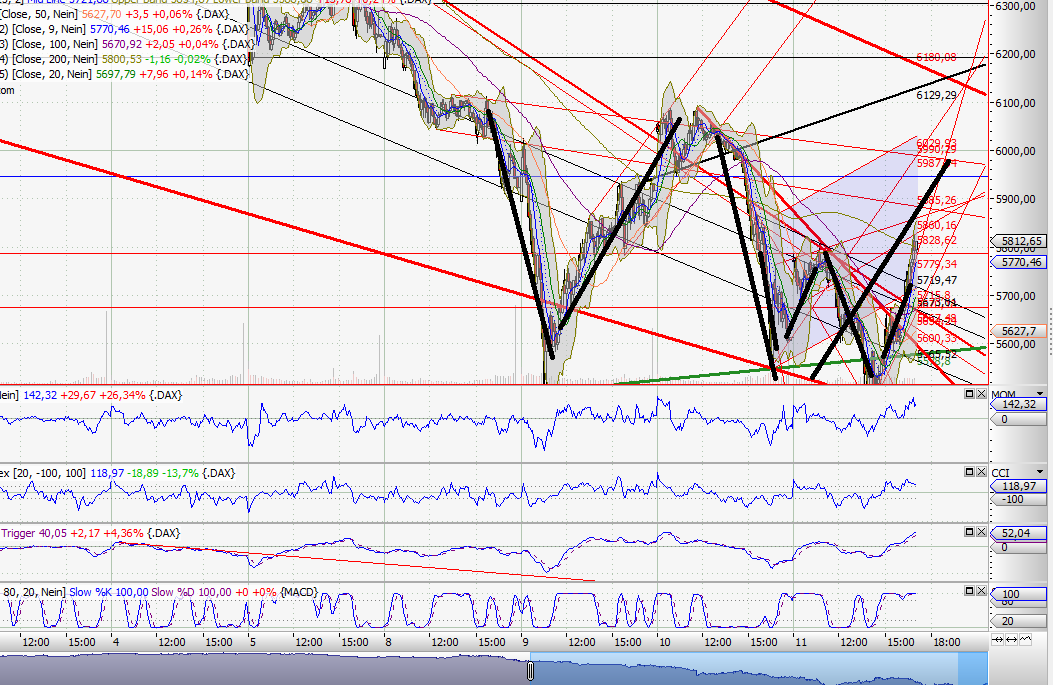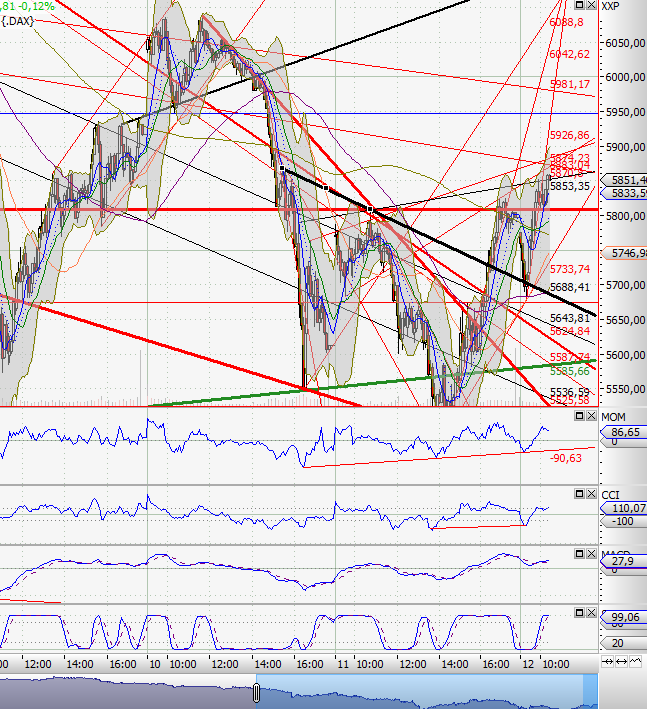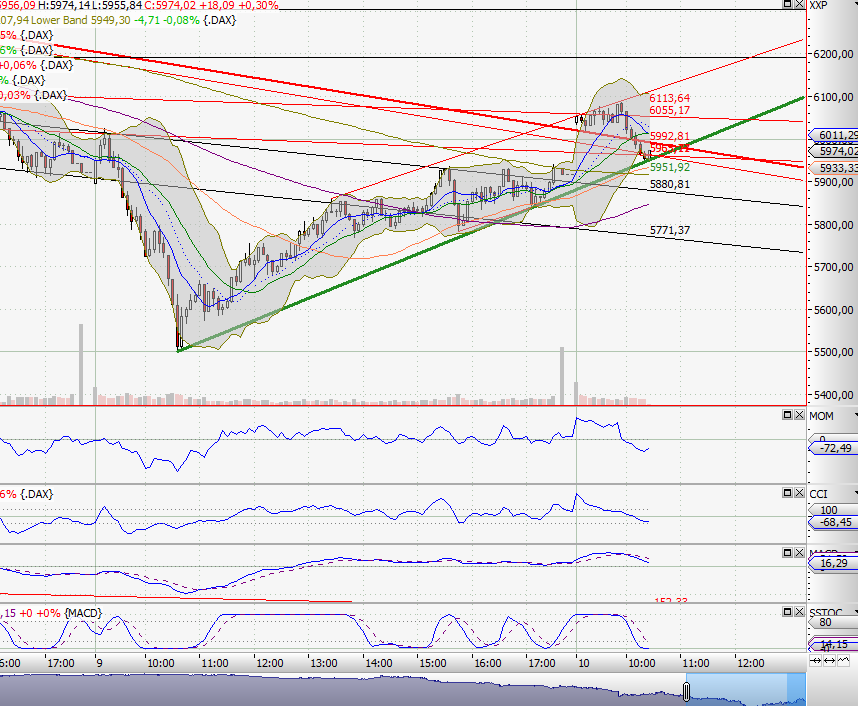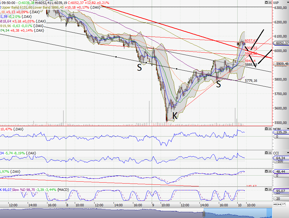Im Daily ist nicht viel passiert, deswegen nur kurz: Nachdem die gelbe Zone im Daily am Freitag gehalten hat, erwarte ich auch für heute nichts anderes. Höchstens noch eine weitere Bestätigung. Dabei hat der DAX allerdings heut schon ziemlich tief eröffnet, und ist dann gestiegen.