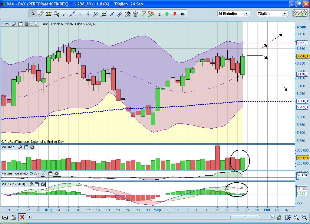 Das Volumen liegt weiter im oberen Mittelfeld, der MACD und das Arron konnten von leicht bärisch auf neutral drehen , ein bullischer Impuls ist im daily damit noch nicht gesetzt, dieser entsteht erst beim überschreiten des oberen Bollingers bei derzeit 6391 Punkten, nice Trades @ all: