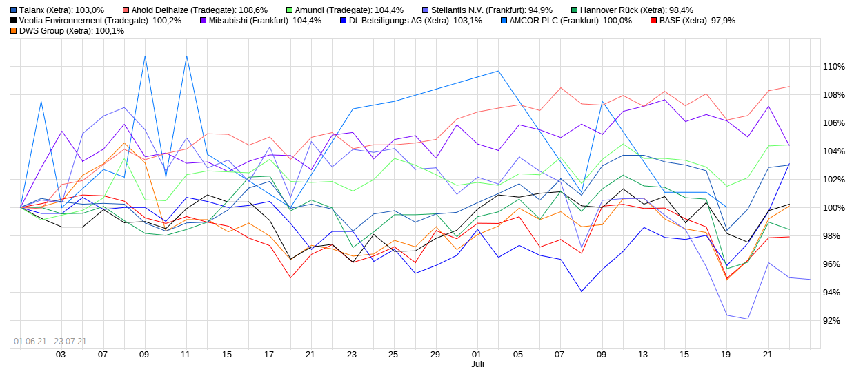 Mit dem Satelliten-Portfolio soll in aktuelle aussichtsreiche Aktien investiert werden. Im Vergleich zum Core-Portfolio es deutlich weniger diversifiziert. Das hängt damit zusammen, dass im Satelliten-Portfolio nur zwischen 10 und 20 Aktien enthalten sind, währen im Core-Portfolio über Fonds-Anlagen in weit über 100 Aktien investiert wird. Wenn also eine Aktie im Portfolio um 10 Prozent fällt, sind die Auswirkungen im Satelliten-Portfolio viel stärker zu spüren als im Core-Portfolio. Das gilt nach unten und natürlich auch nach oben. Die Kursschwankungen beim Satelliten-Portfolio sollten also höher sein als beim Core-Portfolio. Das heisst, die Renditeerwartung, aber auch das Verlustrisiko sind beim Satelliten-Portfolio höher als beim Core-Portfolio.