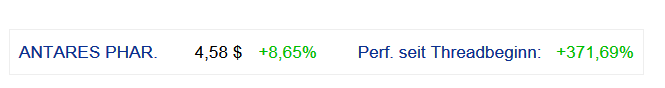 Zudem sollte man nicht vergessen, Antares ist sehr hoch bewertet mit ca. 400 USD Marketcap; ein Aktienanstieg macht nur Sinn, wenn die Umsätze größer werden und weitere Produkte erfolgreich in den Markt eingeführt werden können - und hier steht ja einiges an!!