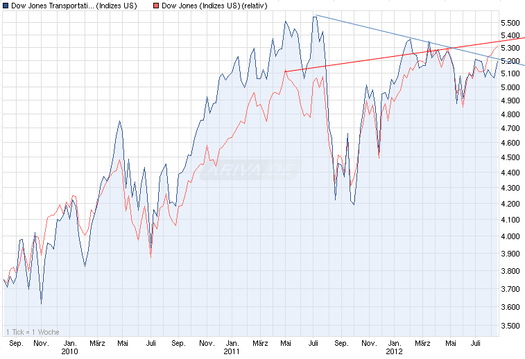 'Bedeutend bei der Dow Theory ist aber nicht nur der Transportindex, sondern auch der Dow Jones Industrial Average. Eine Trendwende wird erst dann als gegeben angesehen, wenn sowohl die Aktien der Industrieunternehmen als auch die Aktien der Transportunternehmen ihre Höhe- beziehungsweise Tiefpunkte nicht mehr bestätigen, wobei die Transportaktien einen vorauslaufenden Charakter haben'.