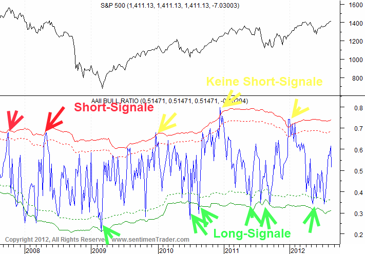 Wie Du deiner Graphik entnehmen kannst gibt es auch eine Ausnahmesituation: den echten, harten Crash. Denn der Long-Entry im Frühjahr 09 entsprang ja nicht der Diagnose 'übergeordnet Bullmarkt', sondern einer systemischen Überlegung bzw einem grundsätzlichen ideologischen Vorbehalt: 1. Kommt es nicht zum Meltdown, handelt es sich um historisch grandiose Longchancen. 2. Wir weigern uns, den Meltdown zu antizipieren, weil eine solche Option unserer Mentalität widerspricht...