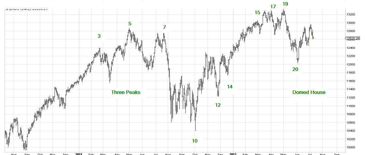 Genau so auf der Suche nach Ein-/ Ausstiegsmöglichkeiten in permanent laufende Kurse stiess ich durch Zufall auf die These der "Three peaks and a domed house": MHurding postete eine winzige 3PDH im Dax: