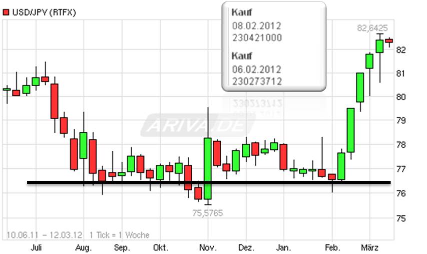 Es deutete sich eine Bodenbildung im USD/JPY an, das Tief im November wurde zu Jahresbeginn nicht mehr getestet und laut der Armitage'schen Symmetriebedingung, mußte es wie es runter ging auch wieder hoch gehen.