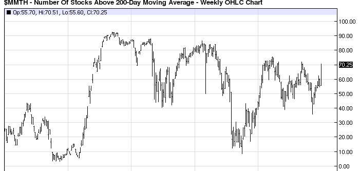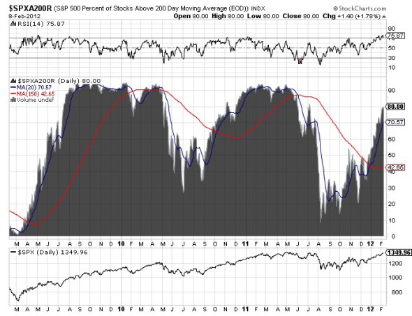 toppt idR im 90% Bereich aus. Daraus ist jedoch nicht zu schliessen, dass dies bereits beim Erreichen dieses Niveaus der Fall sein muss. Denn umgekehrt ist es nur logisch, dass ein relativ konstanter Uptrend nachlaufende Indikatoren erst hoch zieht und dann auch oben hält. 09 / 10 zB blieben die Stocks above EMA 200 für fast 12 Monate auf dem 90% Niveau, während dessen der Index um gut 30 % zulegte: