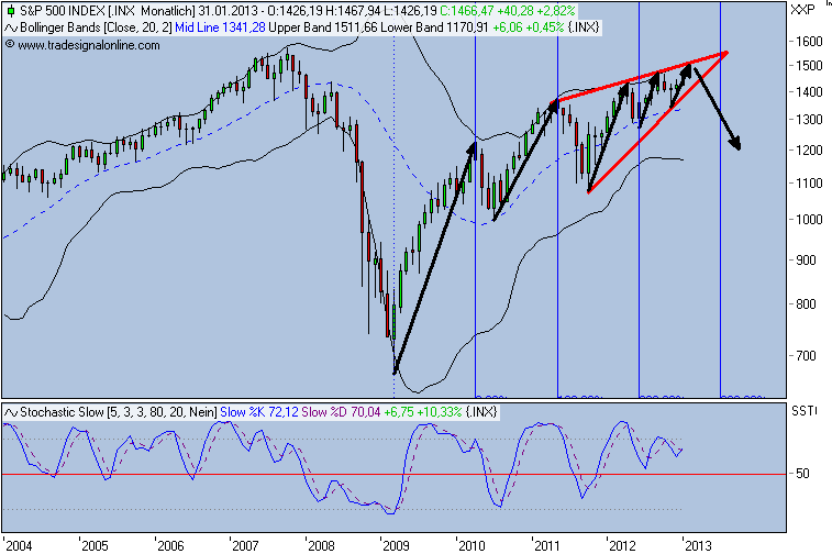 Dein Keil referiert das nachlassende Up-Momentum im S&P. In Verbindung mit dem insgesamt skeptischen Sentiment eigentlich eine Kontraindikation, s.o.. Eigentlich, wenn da nicht ein paar signifikante Anormalien gewesen wären (Vix, Dax, €/$). So wie es aussieht, wird aber gerade in den letzten Tagen in Sachen Momentum nachgezogen. Die Bestätigung steht jedoch noch aus...