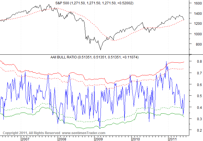 Sentiment surveys meanwhile show a continuing decline in optimism. The Investors Intelligence survey of newsletters has been the most stubbornly bullish among these in recent times. The bears this week increased to 26% (from a recent low of 15.7% in April) and the bulls declined to 37% (from a recent high of 57% in April). The usual suspect of sentiment indicators will arrive with the rest of the week and as always, they will be in the weekly sentiment overview on Friday.