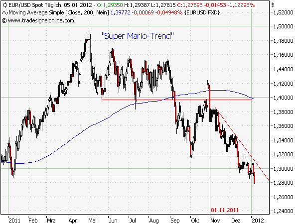 "Welchen Unterschied gibt es zwischen Jean Claude Trichet und Mario Draghi? Der Franzose Trichet sah im Januar Inflationsgefahren, führte zwei Leitzinssatzerhöhungen durch und stärkte damit die europäische Gemeinschaftswährung. Die Entscheidung wurde von vielen „alten Hasen“ am Markt kritisiert, in Bezug auf den Wechselkurs führte es zu einer Erstarkung der europäischen Gemeinschaftswährung. Seit dem 01.11.2011 ist Mario Draghi, ehemaliger Mitarbeiter bei Goldman Sachs, neuer EZB-Präsident und revidierte zunächst die beiden Schritte von Trichet im November und Dezember 2011, so dass es für den Euro/USD hieß: Zurück auf Los! Gestern wurde das Jahrestief 2011 unterboten, so dass die Reisebewegung gen 1,15-20 USD auf dem Weg ist und die Fragestellung darin besteht, ob noch ein oder zwei Leitzinssatzsschritte nach unten in den kommenden Monaten bei der EZB anstehen werden. Zurück auf Los II hieße einen Rutsch auf 1,16-17 USD, denn der Einführungskurses des Buchgeldes Euro vor 13 Jahren lautete im 1,16er Bereich."
