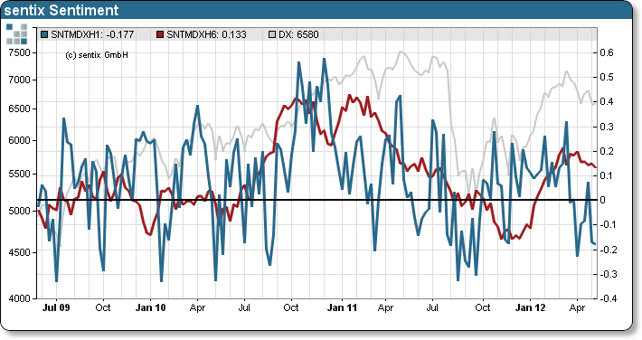Im Moment haben wir die kuriose Situation, dass sich die Eurokrise (die ich stets als finale Krise, also Höhepunkt, der Finanzkrise bezeichnete) wieder zuzuspitzen scheint, aber Gold als Angstindex fällt. Diese Divergenz weist auf einen bevorstehenden deutlichen Kurseinbruch hin - sobald die Krise beendet ist, was allerdings noch bis 2013 dauern kann.