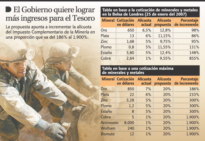The proposal of the Government to modify the Complementary Tax of the Mining (ICM) contemplates increases the aliquot ones that they go from 86% in the case of the silver to 855% for copper. These percentage take into account the published international quotation today.