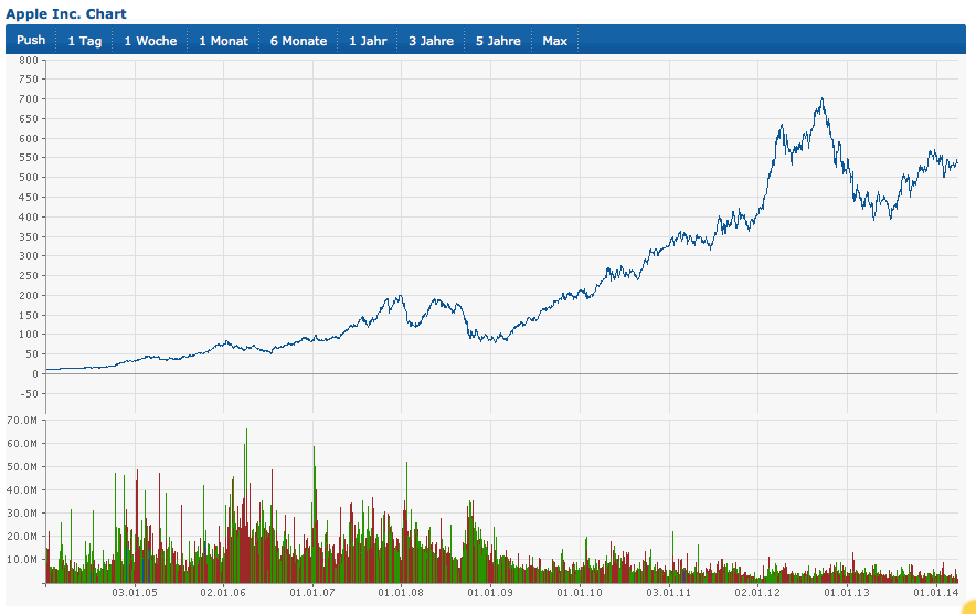 Man sieht auch schön, dass es eine solche 'Hungerperiode' schon häufiger gab, in der Apple nicht gestiegen ist. Sommer 2008 ging es von 200$ runter auf 100%, d.h. 50% und blieb da etwa sechs Monate von Herbst bis Frühjahr 2009.