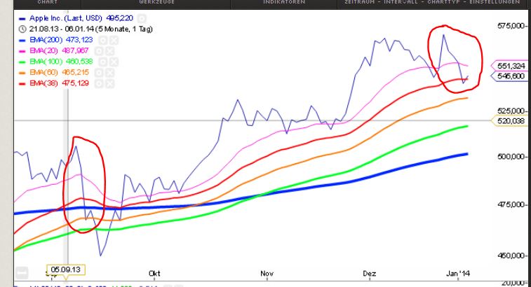 Jetzt scheint es sich zu erholen, das Bild auf Tagesbasis sieht jedoch ähnlich dem von 12.09.13, nach der Präsi von 5C und 5S - erst tiefer Fall, leichter Anstieg, dann wieder tiefer Fall.