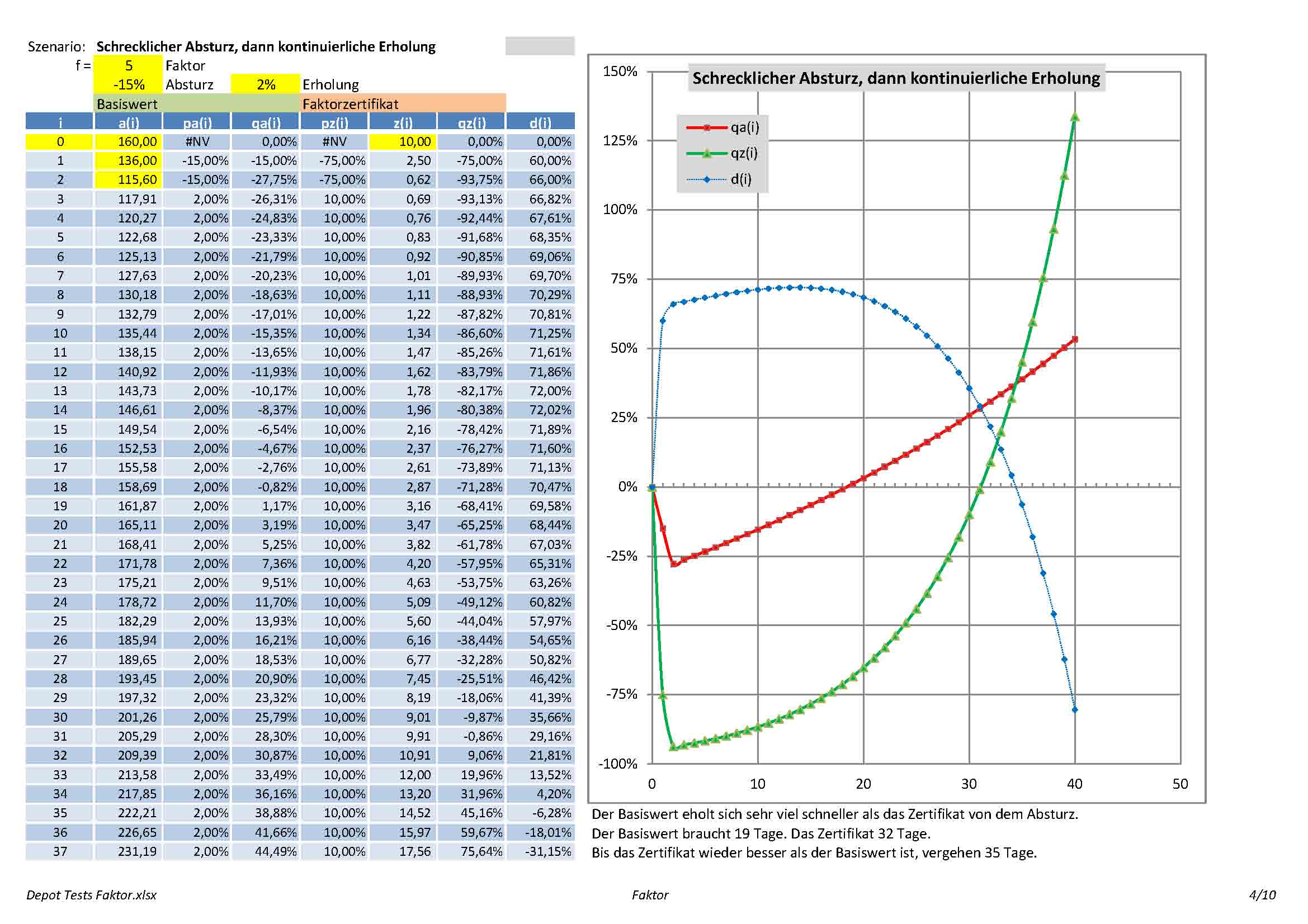 - Seite 4-5: Szenario "Schrecklicher Absturz, dann kontinuierliche Erholung". Man sieht, dass sich der Basiswert sehr viel schneller von dem Absturz erholt als das FZ.