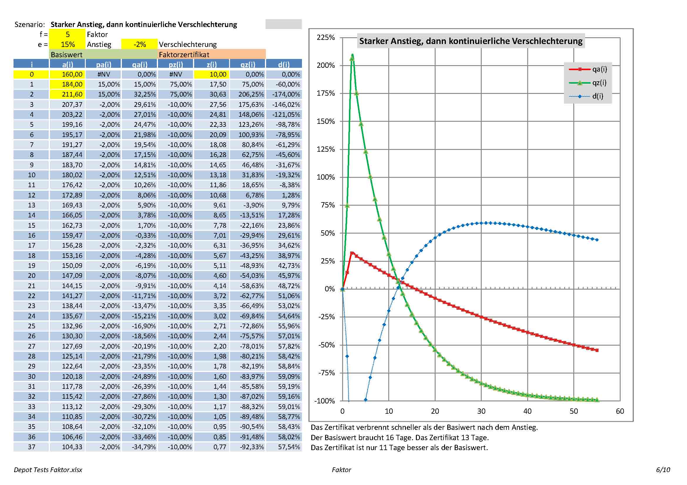 - Seite 6-7: Szenario "Starker Anstieg, dann kontinuierliche Verschlechterung". Man sieht, dass das FZ schneller als der Basiswert nach dem Anstieg verbrennt.