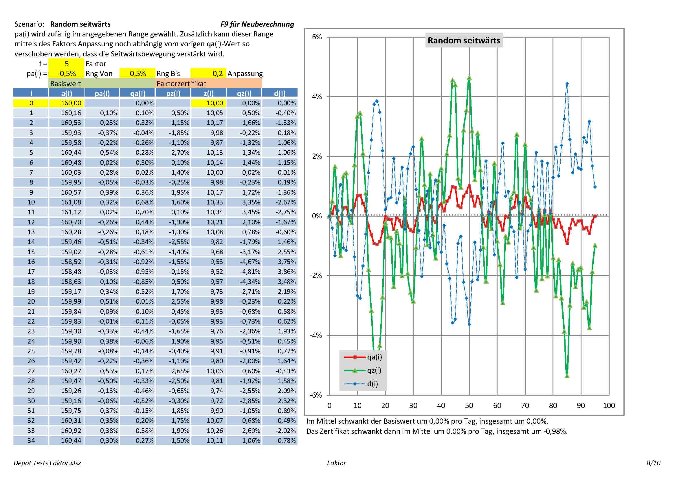 - Seite 8ff: Szenario "Random seitwärts". Damit kann man mit Zufallszahlen spielen, die den Basiswert insgesamt seitwärts gehen lassen (F9 in Excel für Neuberechnung). Man sieht, dass das FZ natürlich jede Änderung des Basiswerts verstärkt, insgesamt aber nichts passiert, solange es tatsächlich seitwärts geht. Nur wenn ein kleiner Aufwärts- oder Abwärtstrend besteht, steigt, bzw. fällt das FZ. Fällt aber deutlich stärker als es steigt.