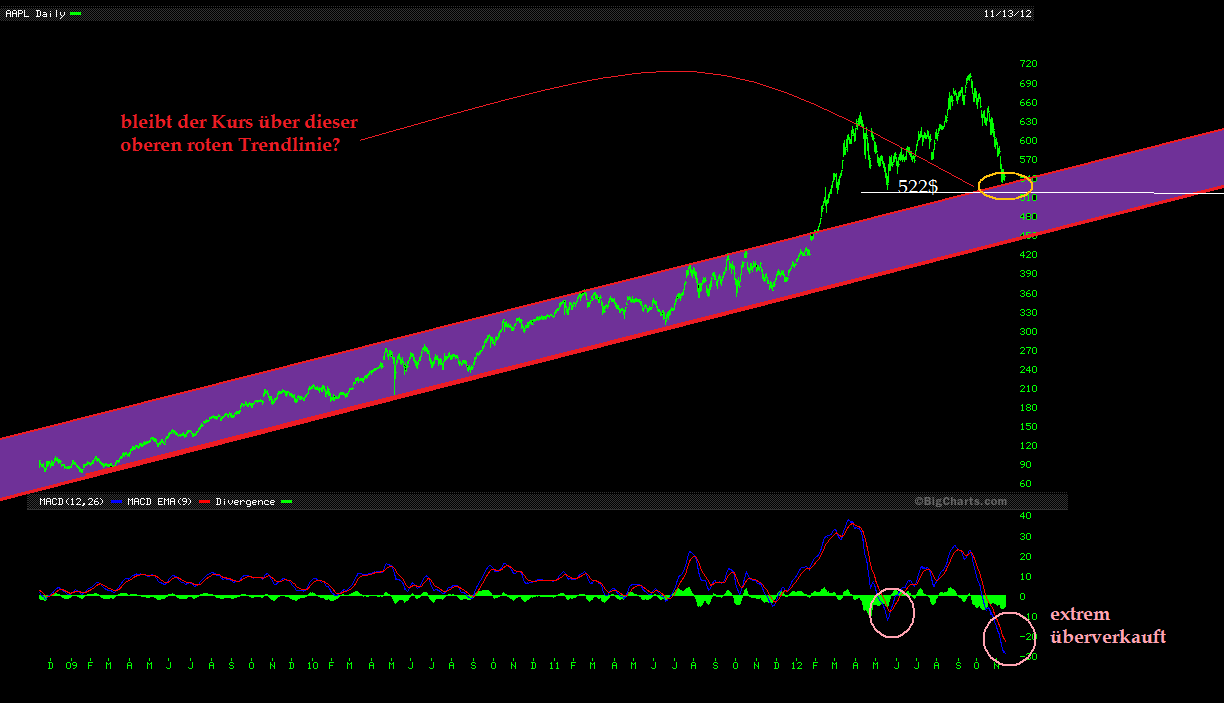 Wenn ich mir den Chart von Apple so anschaue scheint die Aktie bei zirka 540 Dollar abzuprallen. Trendwende in Sicht? Wenn die 540 Dollar bis Ende der Woche halten dann würde ich definitiv nachkaufen!! :)