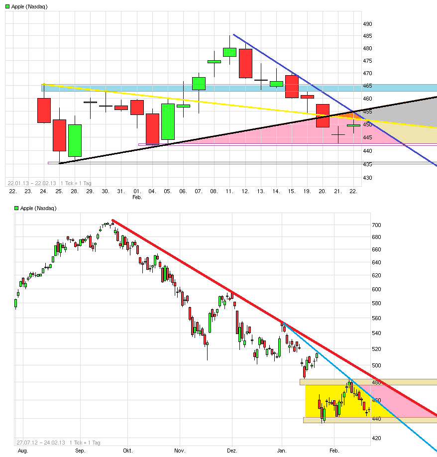 Momentan haben Einhorn & Medien in der Apple-Kritik Oberwasser, weil die neue Granate im Sortiment auf sich warten lässt. Long hat man aber mit vorübergehende Manipulationen und Bashings kein Problem. Immerhin sitzt der Einhor ja mit im Boot und wird sich seine Performance nicht aus Wut über Cook versauen. Aber mittelfristig könnte er den schnellen Rebound verzögern. Um den Einhorn ist es aber nicht schade, wenn er aussteigt! Denn ich will wertsteigernde Maßnahmen wie Aktienrückkauf und Zukäufe innovativer Firmen. Und weiterhin finanzielle Unabhängigkeit Apples von den Finanzhaien. Der Machtkampf Apple gegen Großinvestoren kann wegen der Riesenrücklage nur zugunsten Apples ausgehen. Natürlich muss 2013/14 mehr als Updates/Upgrades kommen. Die nächste Rakete fegt dann aber auch einäugige Dummbasher-Journalisten wie Hajo Schumacher hinweg. Wie kann sich einer, der sich gern elitär als Philosoph geriert zu so profaner Produkt-Kritik herablassen? Samsung, ik hör dir trapsen.