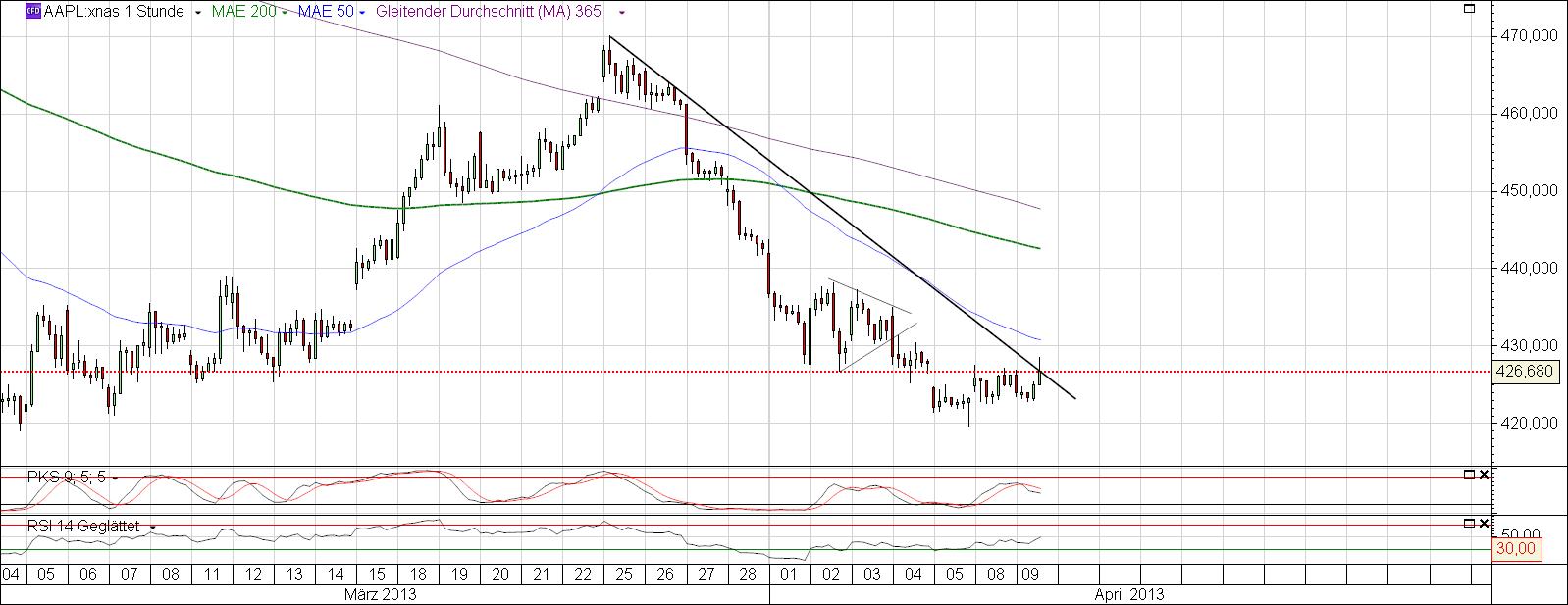 werden die Zocker immer wieder kleinere Kursbewegungen auslösen. Die Großinvestoren sind bis dahin fast alle auf Halteposition. Und wenn sich einer wie Goldman doch noch von einer größeren Position trennen sollte, kann der Kurs ganz schnell mal unter die 420 $ gehen. Für Charttechniker ein schlimmes Zeichen. Für mich ist erst die 400er Marke von Belang, weil ich wegen der runden Zahl da vermehrt SLs vermute. Andererseits sind die 400 aber auch vermehrt Einstiegssignal. Deshalb müsste da schon richtig Volumen auf einen Schlag verkauft werden, wenn die 400 $ fallen sollen. Das erwarten wir Apple-Positiven doch erst am 23./24.04. im Fall stagnierendem Gewinne gepaart mit mäßigem Ausblick und womöglich immer noch ohne konkrete Produktankündigungen wie das momentan der Fall ist.