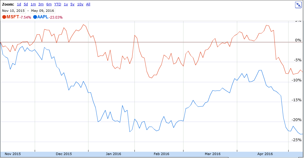 "Nur, dass Dein Chart selektiv ausgewählt war, um Microsoft besser aussehen zu lassen - entgegen Deinen bisherigen Gewohnheiten hast Du diesmal eben kurzfristige Charts vermieden.