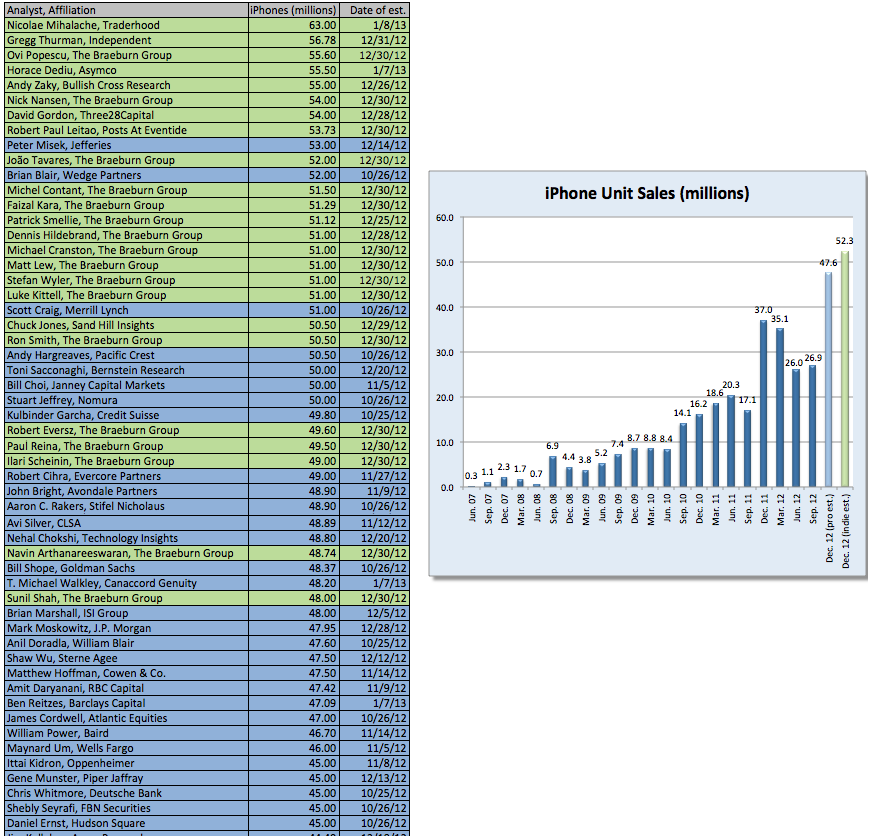 The analysts' forecasts range from 43 million to 63 million. Median estimate: 49.5 million-- A year ago, Apple (AAPL) blew past all expectations by reporting sales of 37 million iPhones in the Christmas quarter, 128% more than the year before and a cool 10 million units better than the median analyst's estimate. That's what analysts call a tough compare. Nobody expects a repeat of that kind of surprise in two weeks when the company reports its first quarter earnings for fiscal 2013. Breakneck growth like that just can't go on forever -- especially with Samsung flooding the market with cheaper knock-off Androids. Also, Q1 2012 had an extra week -- 14 rather than the usual 13 -- a fact I fully expect many reporters to forget when they do their year-over-year growth calculations this time around. Still, as the two tall bars in the chart above suggest, the 57 analysts we've heard from so far -- 33 professionals and 24 independents -- expect that Apple managed to ship a ton of iPhones in the quarter that ended Dec. 29. The high estimate of 63 million -- from congenitally bullish independent Nicolae Mihalache -- represents 84% growth year over year (adjusted for the short quarter). Topeka Capital's Brian White, despite his Street-high $1,111 price target, has come in with the lowest estimate of all: 43 million, up only 26% (adjusted) above last year. You're probably safer betting on a number closer to the median: 49.5 million, up 45% from last year (or 34% if you ignore the extra week). We'll find out which of our analysts was closest to the mark when Apple reports its earnings after the markets close on Wednesday Jan. 23. Below: The analysts' individual estimates, with the pros in blue and the amateurs in green.
