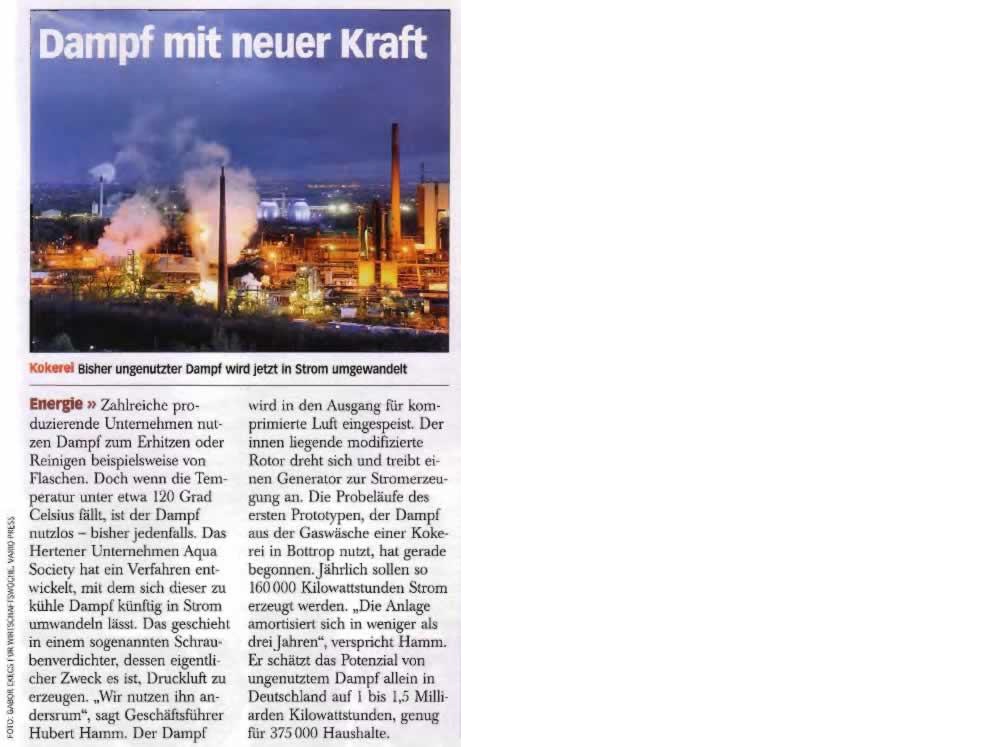 Die bei industriellen Prozessen anfallende Abwärme im Niedertemperaturbereich bis 100°C stellt in allen Industrienationen ein weitgehend ungenutztes Energiepotenzial dar. Aqua Society hat ein neues Verfahren zur Stromerzeugung aus Niedertemperaturwärme entwickelt.