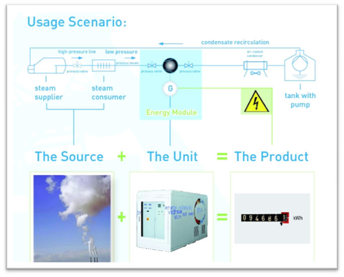 Ausgehend von diesen Voraussetzungen und bei kontinuierlichen Dampfströmen amortisiert sich das Energiemodul innerhalb von nur drei Jahren und kann einen bedeutenden Beitrag zur Effizienzsteigerung des gesamten Industrieprozesses leisten. Das Energiemodul wird derzeit, abhängig von der Dampfmenge beim Kunden, in Leistungsklassen von 10 bis 500 kW elektrischer Leistung angeboten.