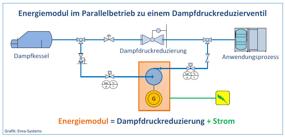 Ein Rechenbeispiel für einen typischen Anwendungsfall, wie er in der Papierindustrie, der Lebensmittelindustrie, der Chemischen und Pharmazeutischen Industrie sowie bei der Energieerzeugung und in der Petrochemie häufig vorkommt, verdeutlicht das große Potenzial dieses Verfahrens: Bei einem Eingangsdruck von 3,8 bar (abs.) und einem Ausgangsdruck von 1,4 bar (abs.) erzeugt das Energiemodul – bei einem angenommenem Dampfstrom von 6.000 kg pro Stunde – eine elektrische Leistung von 110 Kilowatt.