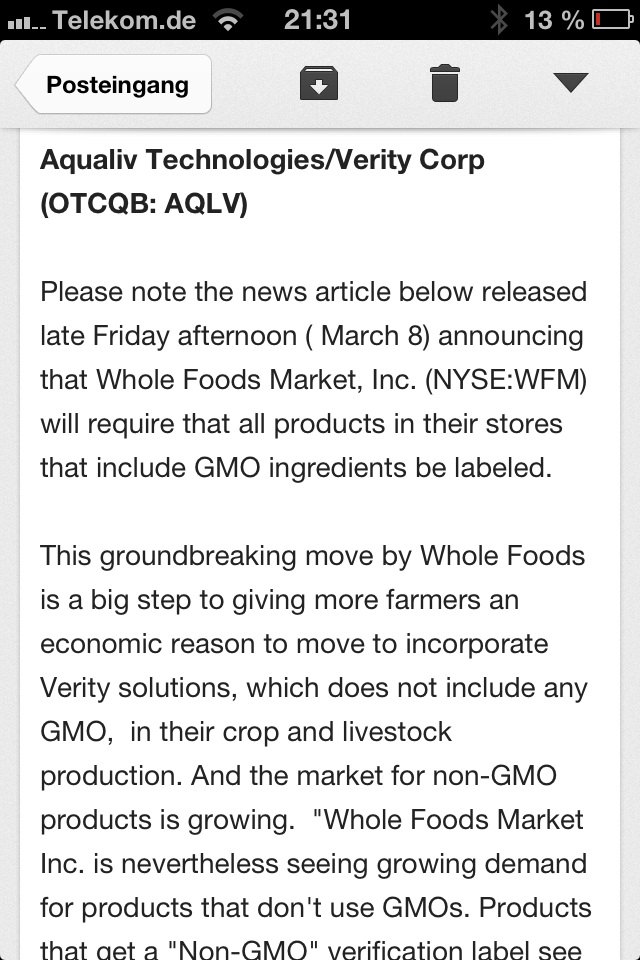 Please note the news article below released late Friday afternoon ( March 8) announcing that Whole Foods Market, Inc. (NYSE:WFM) will require that all products in their stores that include GMO ingredients be labeled.This groundbreaking move by Whole Foods is a big step to giving more farmers an economic reason to move to incorporate Verity solutions, which does not include any GMO, in their crop and livestock production. And the market for non-GMO products is growing. "Whole Foods Market Inc. is nevertheless seeing growing demand for products that don"t use GMOs. Products that get a "Non-GMO" verification label see sales spike between 15 percent and 30 percent, said A.C. Gallo, president of Whole Foods. In non-perishable groceries, he said the two fastest growing areas are organic and non-GMO products."