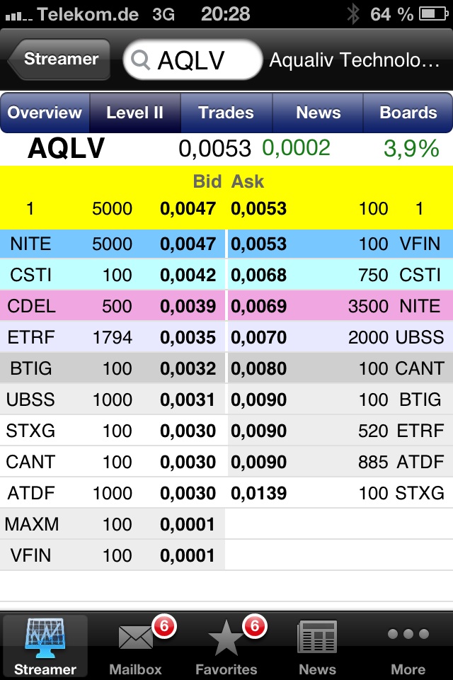 wenn man wüsste wieviele Aktien auf der 0,0053 liegen... Stell dir vor da sind rund 50 Millionen Stück... Dann geht's wohl heut nimmer höher... Wir brauchen Level2 für AQLV... Hab viel geschaut doch nur für andere Aktien Level2 Quotes für ümme gefunden, AQLV war nie dabei... Bats Exchange ist ganz cool für Level2...