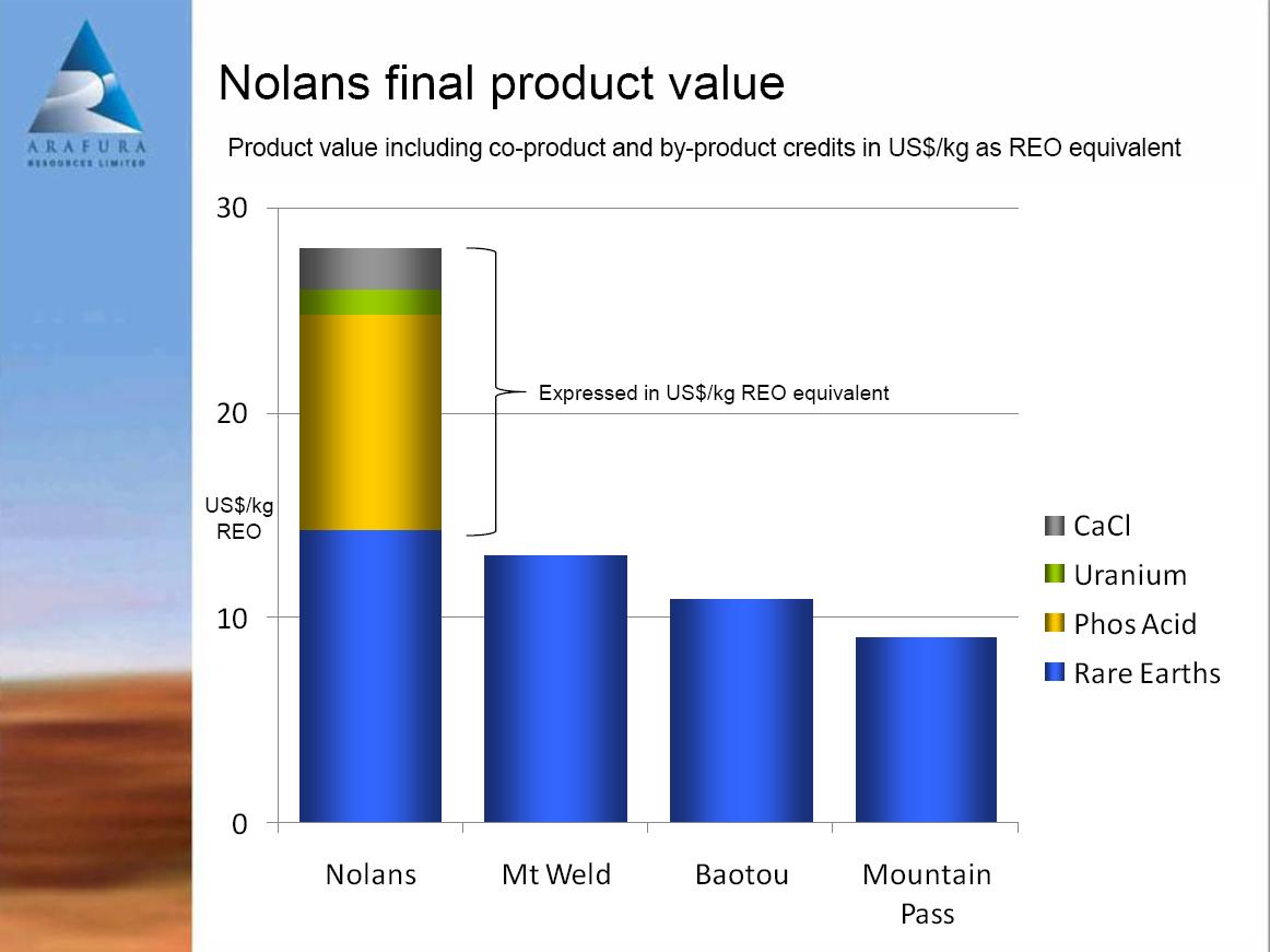 2. Das Management von Arafura hat eine klare Vision entwickelt, wie die Unternehmensgruppe allein um das Nolans Bore Vorkommen herum in Zukunft aussehen wird. Zu zwei von drei Gesellschaften stehen vertragliche Verhandlungen mit schwergewichtigen Partnern vor dem Abschluss. Zwei Gesellschaften werden zu 100% bei Arafura verbleiben(davon eine ohne Partner), eine dritte Gesellschaft durch Arafura majorisiert. Im Rahmen einer Präsentation von Dr. Siebholz wurde in Anwesenheit von AS ein chinesischer Partner für die dritte Gesellschaft benannt. Dieser Partner wird die Fabrik für die Separation der Seltenen Erden und die Weiterführung des Herstellungsprozesses bis zu Reinstmetallen und -Oxiden beisteuern.